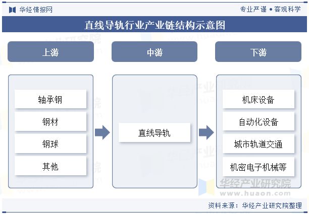 直线导轨行业产业链上游为原材料及零部件,主要为轴承钢、钢材、钢球等;产业链中游为直线导轨生产企业;产业链下游为直线导轨行业应用领域,主要为机床设备、自动化设备、城市轨道交通、机密电子机械等。