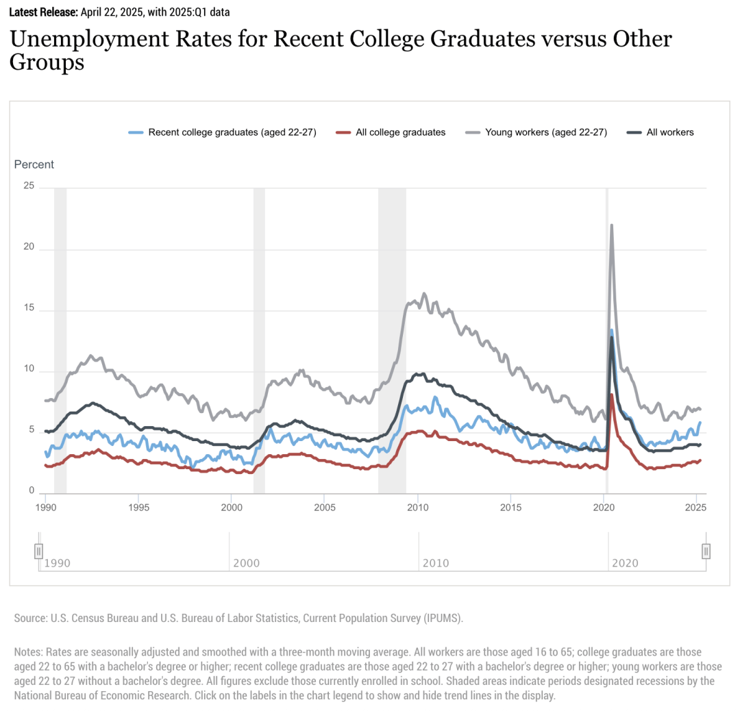 纽约联邦储备银行的数据显示,2025年初,应届大学毕业生的就业状况「显著恶化」,失业率从一年前的4.6%跃升至5.8%。