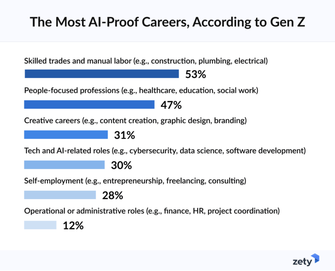 Z世代们不再迷信传统的职场晋升路线,反而更看好那些实操性强、不容易被AI取代的工作。