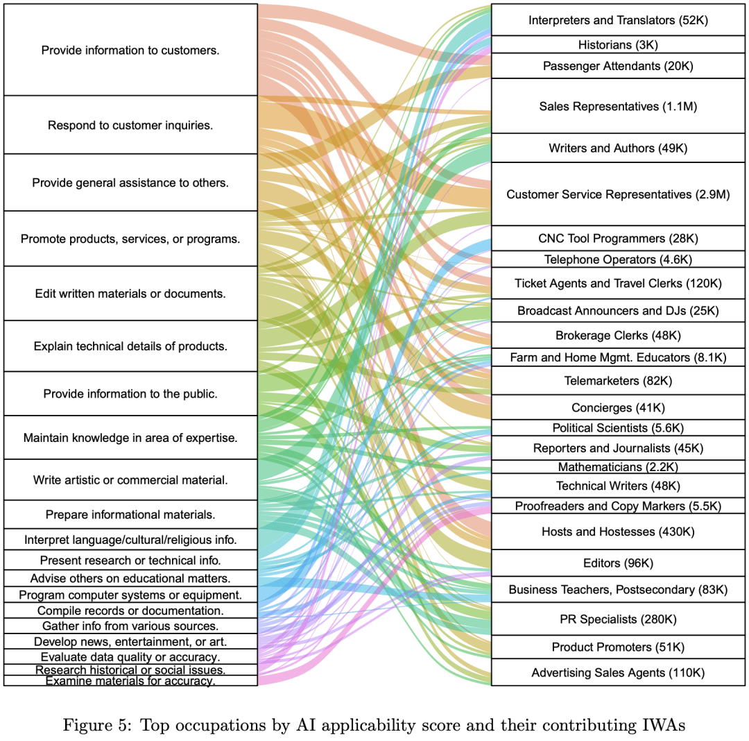这个指标,专门是用来衡量哪些岗位,容易被AI替代。其中考量了,AI在该领域的适用频率,以及应用的成功度。